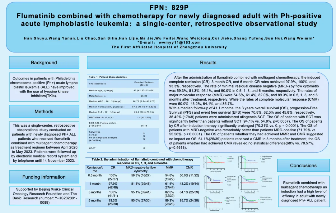 3. Wang Weimin et al. ESMO 2024 FPN:829P: Flumatinib combined with chemotherapy for newly diagnosed adult with Ph-positive acute lymphoblastic leukemia:a single-center, retrospective observational study.